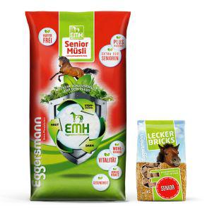 EMH Senior Müsli ist eine innovative, mit EMH aufgewertete Spezialmischung, welche die Bedürfnisse alter Pferde und solcher in regenerativen Phasen optimal berücksichtigt.